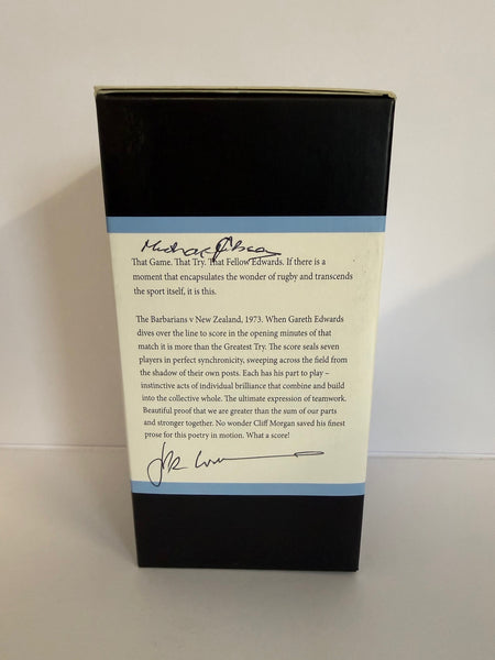 The Greatest Try Gin is personally autographed by Sir Gareth Edwards. This special commemorative edition is housed in a box exclusively autographed by the 7 iconic members of the 1973 Barbarians team who attended the 50th Anniversary Lunch in 2023. This offer cannot be repeated and comes with the highest provenance from Sir Gareth himself.